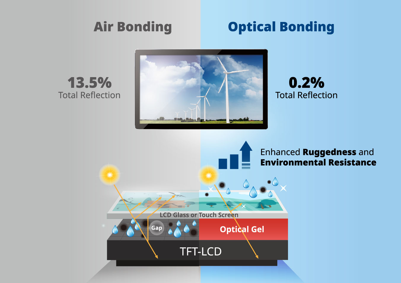 Lannaíonn sé painéil LCD ag baint úsáide as gliú optúil gan bearnaí aeir a chruthú